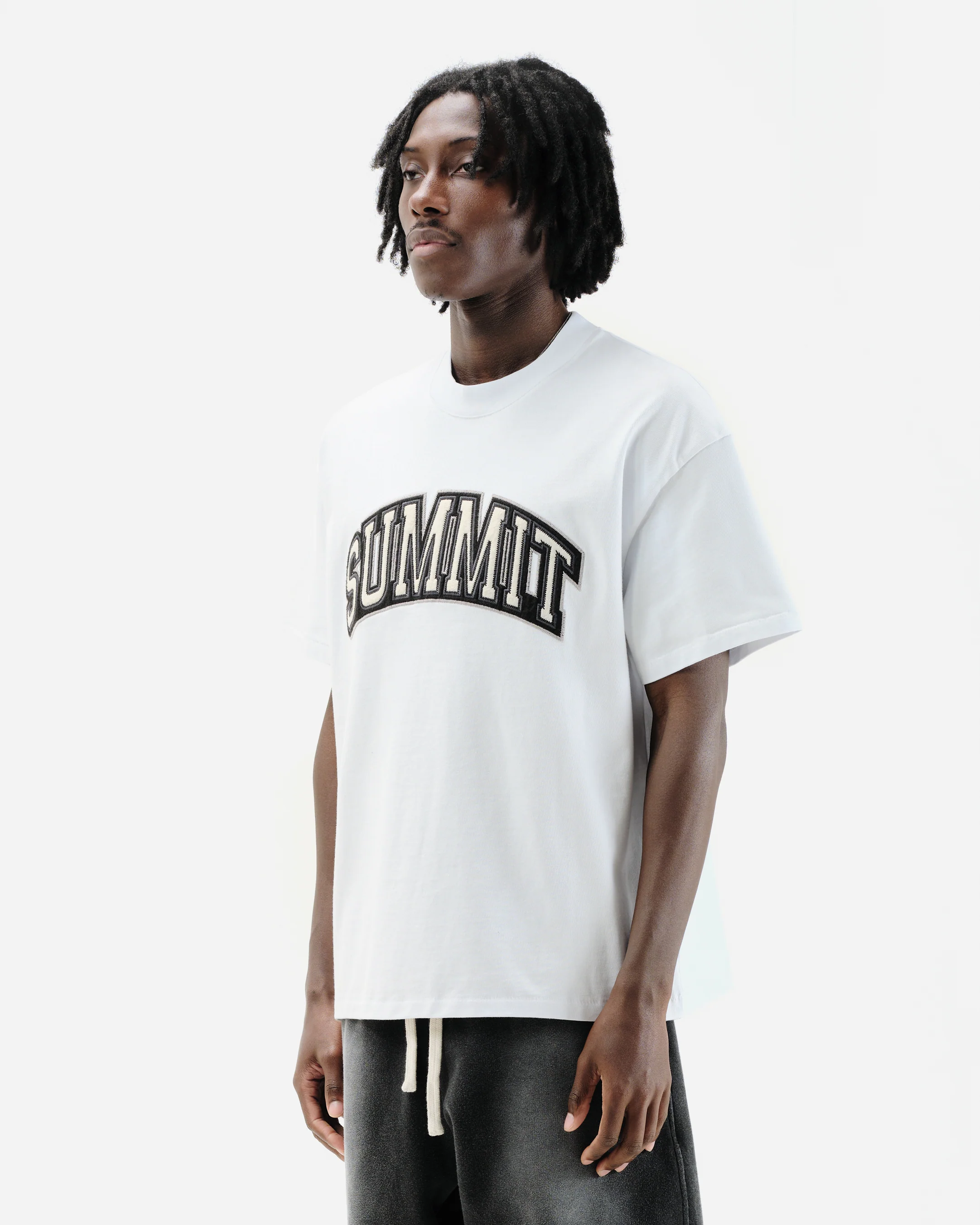 A boxy fit t-shirt inspired from true vintage t-shirts.Ā Cut from a 380GSM single jersey which undergoes a garment dye and pre shrink process to create the perfect jersey. Finished with our triple colour hand applied applique college logo design to the front chest.