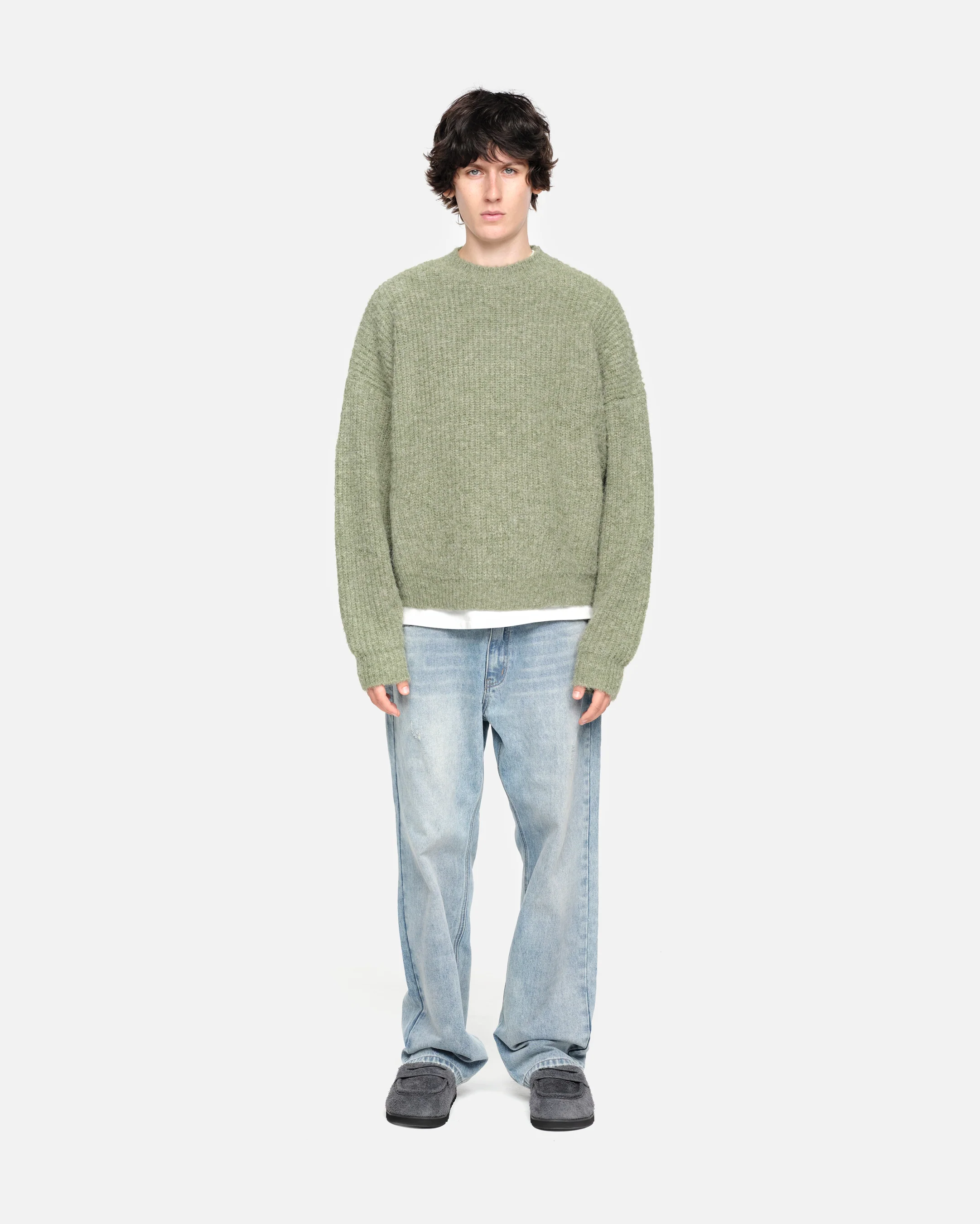 A chunky gauge knit in a brushed hairy wool blend yarn knitted into our cropped jumper silhouette.Ā A boxy cropped fit designed for layering or wearing as a signature piece.