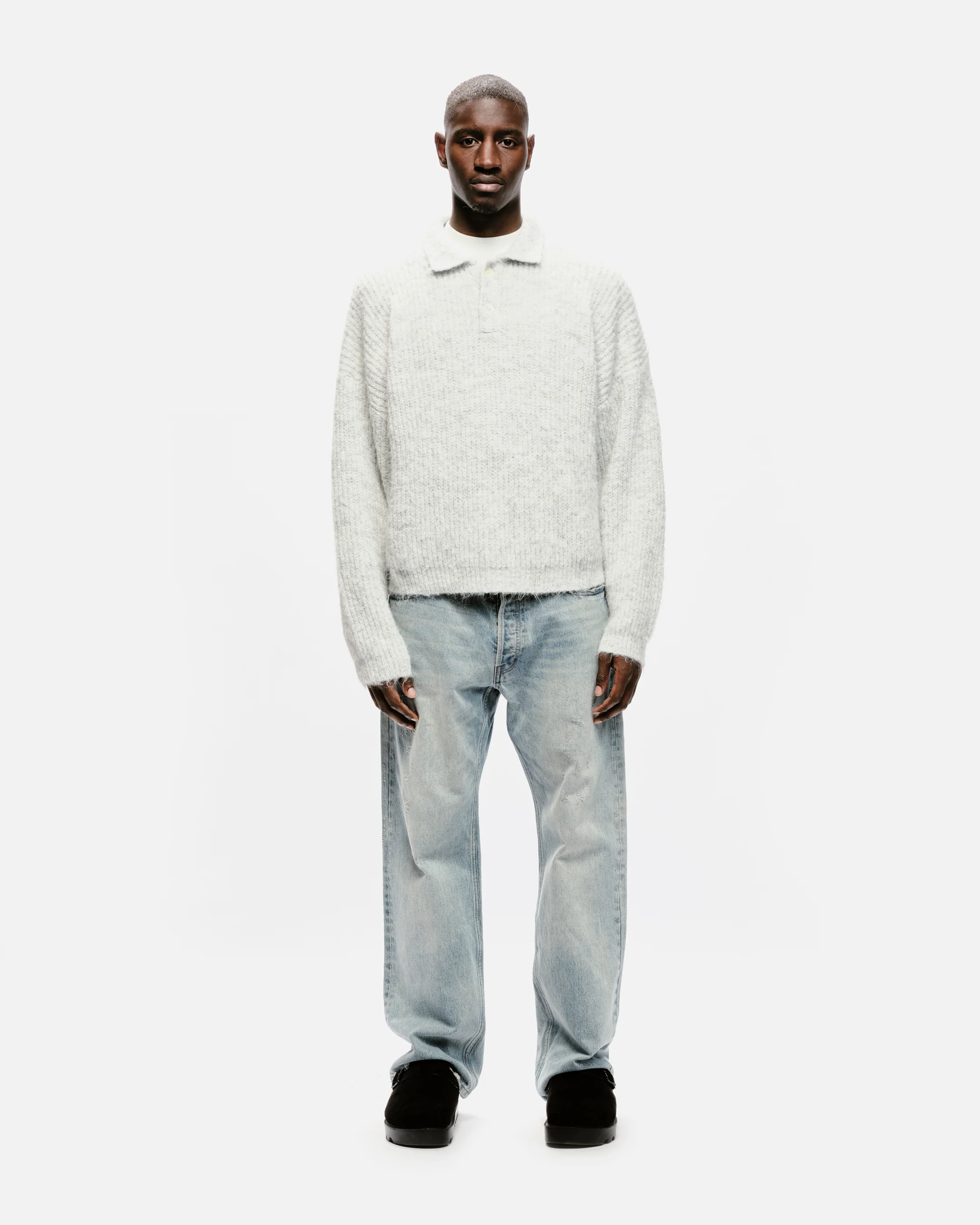 A chunky gauge knit in a brushed hairy wool blend yarn knitted into our cropped polo silhouette. A boxy cropped fit designed for layering or wearing as a signature piece.