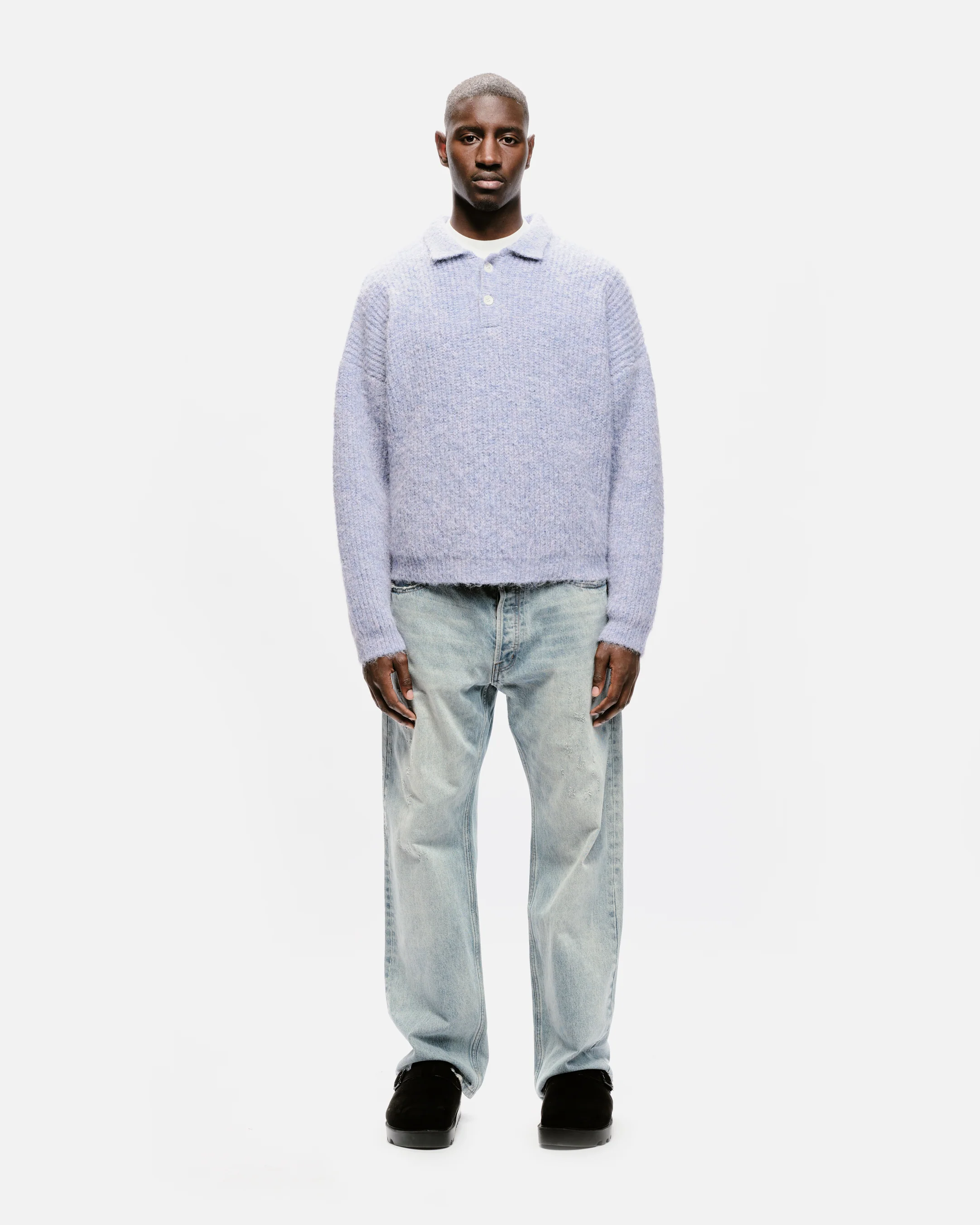 A chunky gauge knit in a brushed hairy wool blend yarn knitted into our cropped polo silhouette.Ā A boxy cropped fit designed for layering or wearing as a signature piece.
