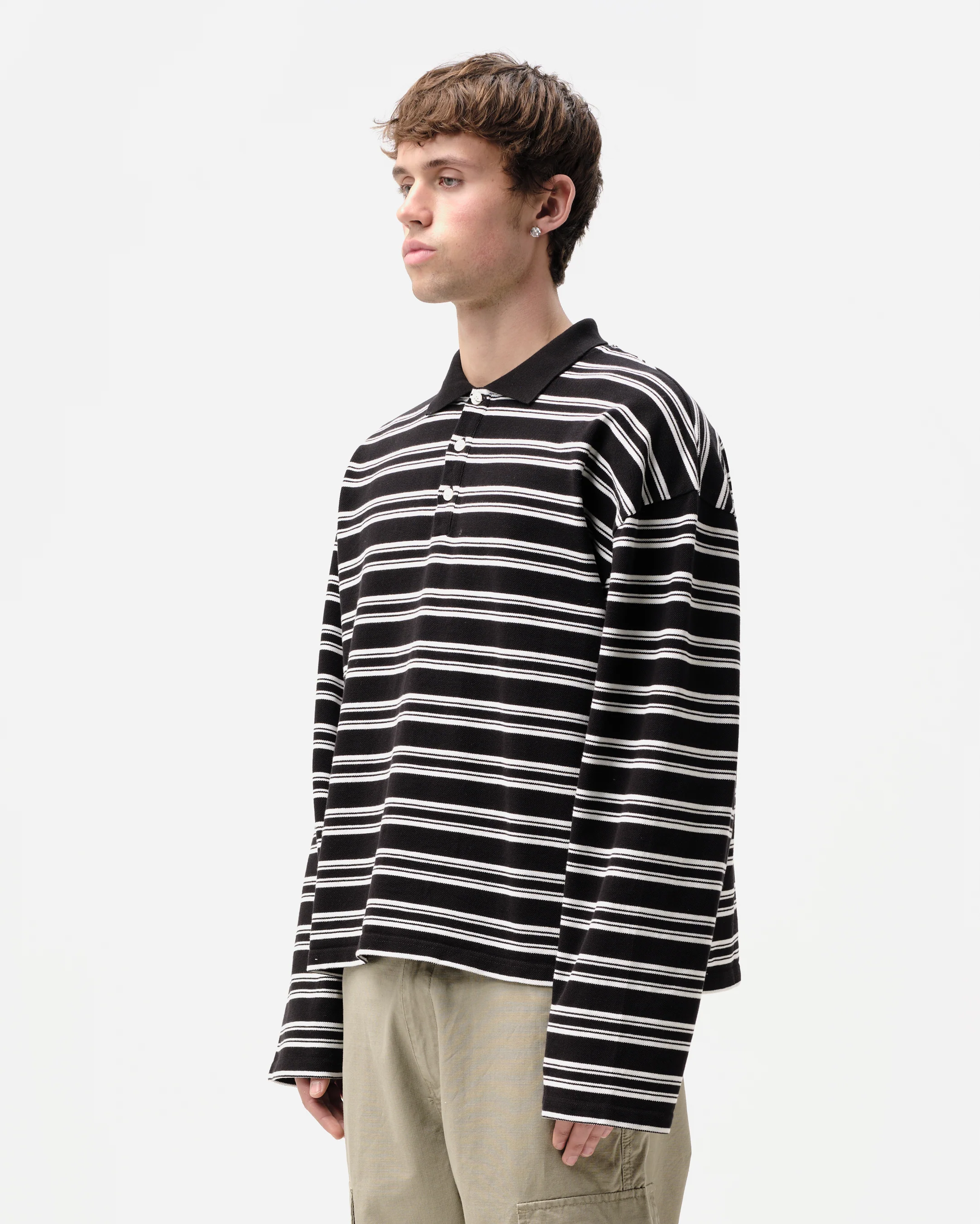 A boxy slightly cropped fit long sleeve polo inspired from true vintage Americana cuts.Ā Cut from a 300GSM 100% cotton Pique jersey which is custom knitted with our stripe pattern, finished with a classic rib collar and 3 button placket.