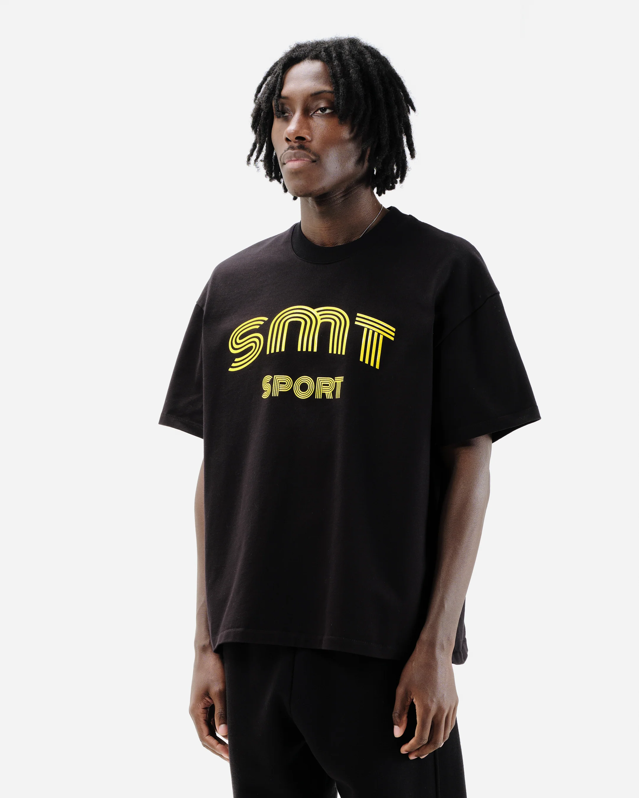A boxy fit t-shirt inspired from true vintage t-shirts. Cut from a 380GSM single jersey which undergoes a garment dye and pre shrink wash for the ultimate last. Finished with a front SMT SPORT line graphic which is printed in a specialist gloss silicone rubber ink.