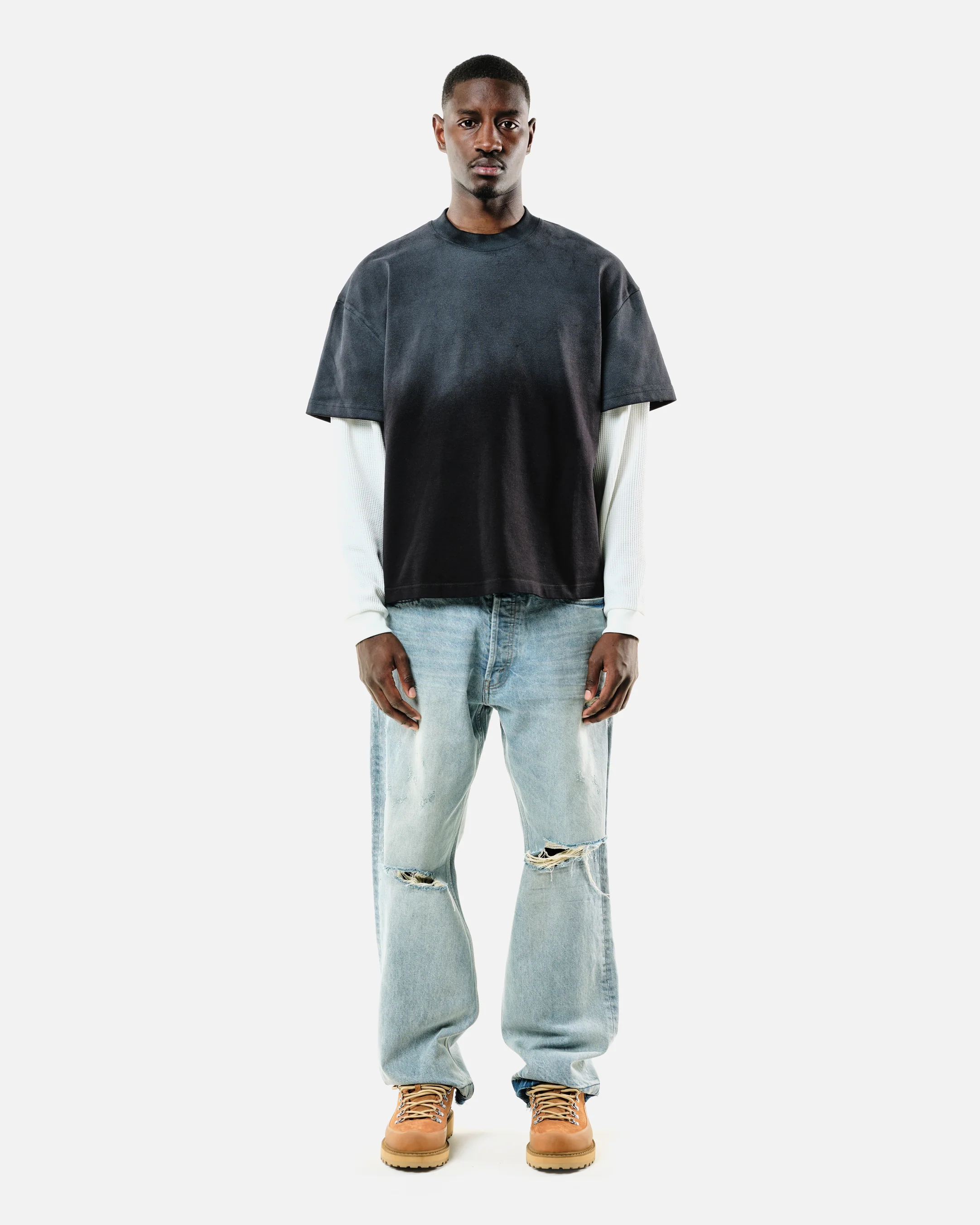A boxy, cropped fit t-shirt inspired from true vintage t-shirts.Ā Cut from a 380GSM single jersey which undergoes a vintage wash to fade the colour slightly and pre shrink the garment for the ultimate last.Ā The sleeve is layered with our 350GSM chunky waffle fabric with a loose rib cuff and finished with our made tough branding to the back..